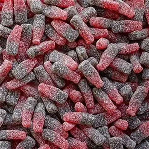 sirop de glucose-fructose, sucre, gélatine, acidifiants (acide citrique, acide malique), colorant (E170), correcteur d'acidité (malates de sodium), sucre caramélisé, arômes, denrées alimentaires colorantes (concentré de radis, pomme, cassis).