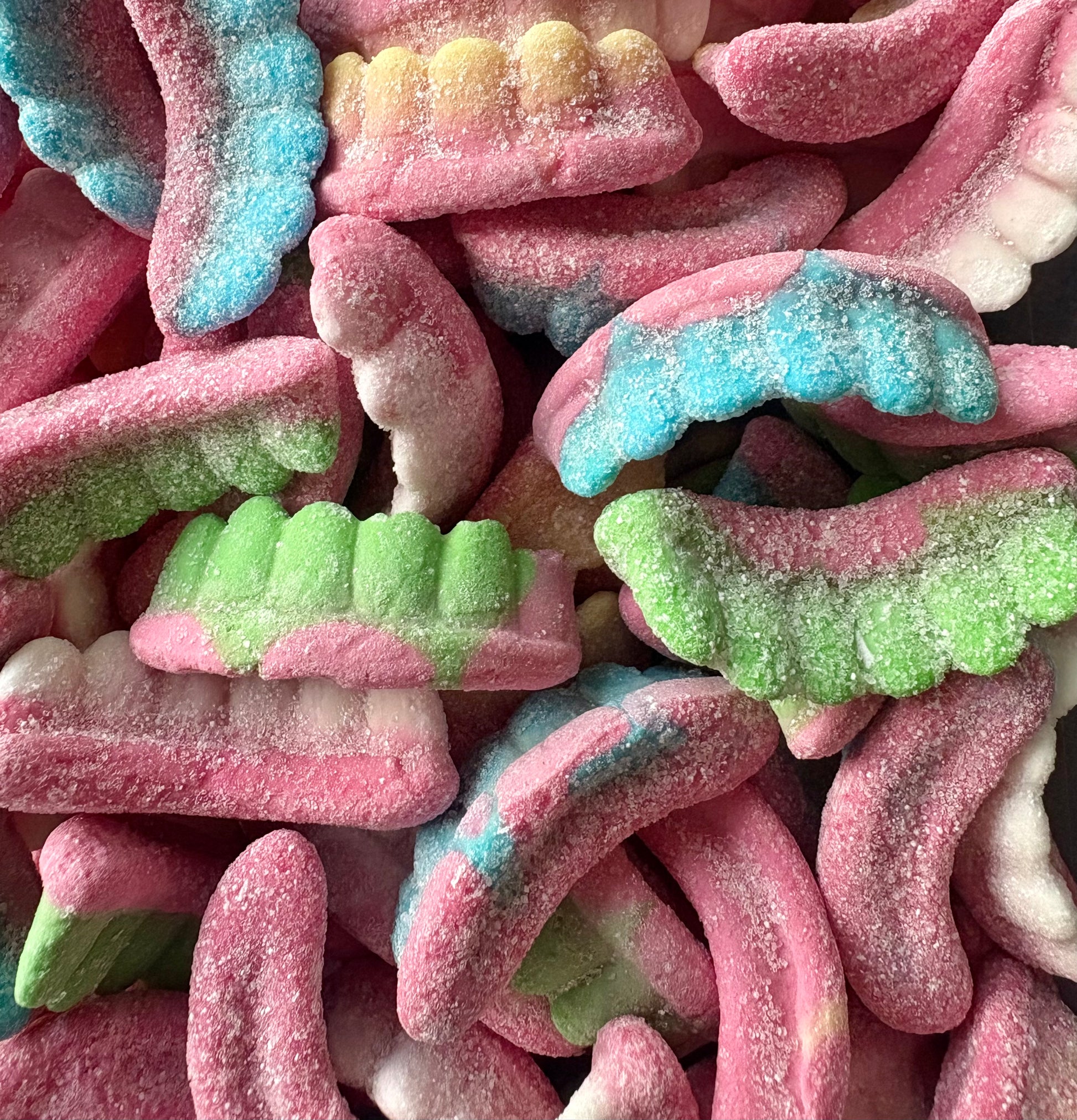Sirop de glucose, sucre, eau, gélatine de boeuf, amidon modifié de pomme de terre, acidifiants : E330, E270, agent d'enrobage : huile végétale (palme), E901, E903, arômes, colorants : E129, E100, E133.