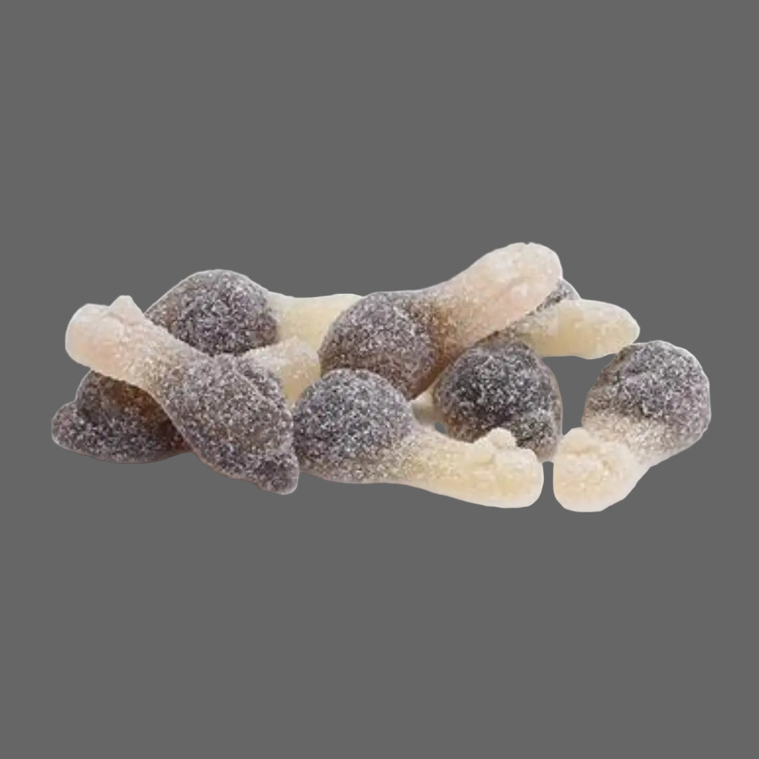 Sucre, sirop de glucose, eau, gélatine, acidifiants (E296, E330, E334), arôme cola, régulateur d'acidité (E331), colorant (E150).