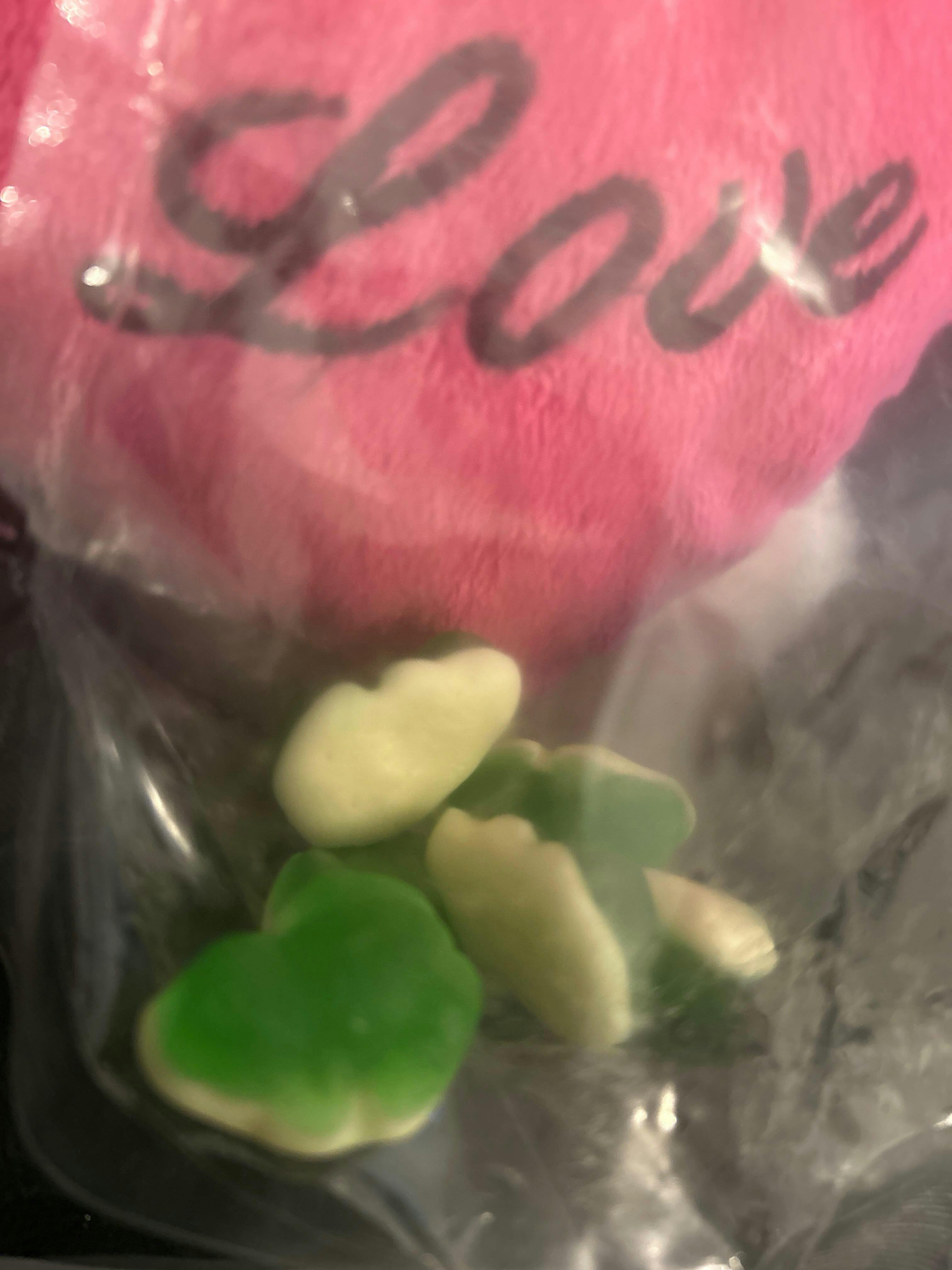 Ingrédients : Sirop de glucose, sucre, dextrose, gélatine, acidifiant : acide citrique, concentrés de fruits et de plantes : spiruline, carthame, pomme, agent d'enrobage : cire d'abeille blanche et jaune, cire de carnauba, arôme, sirop de sucre inverti.